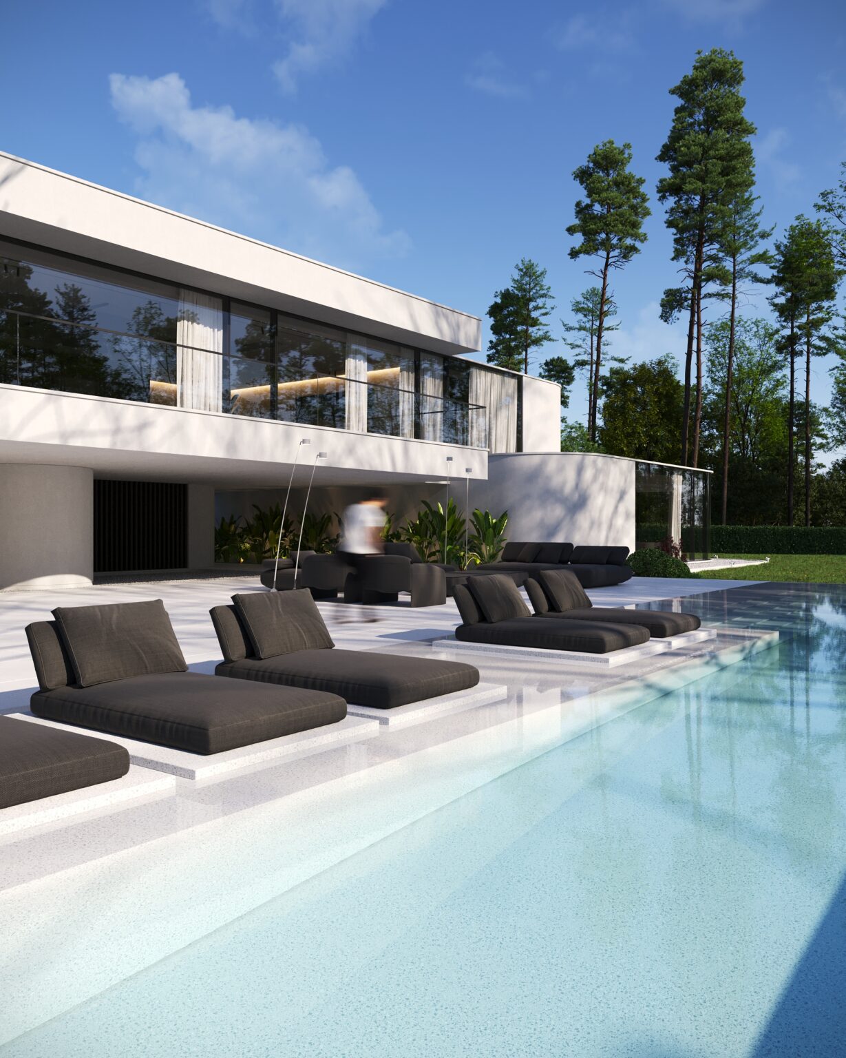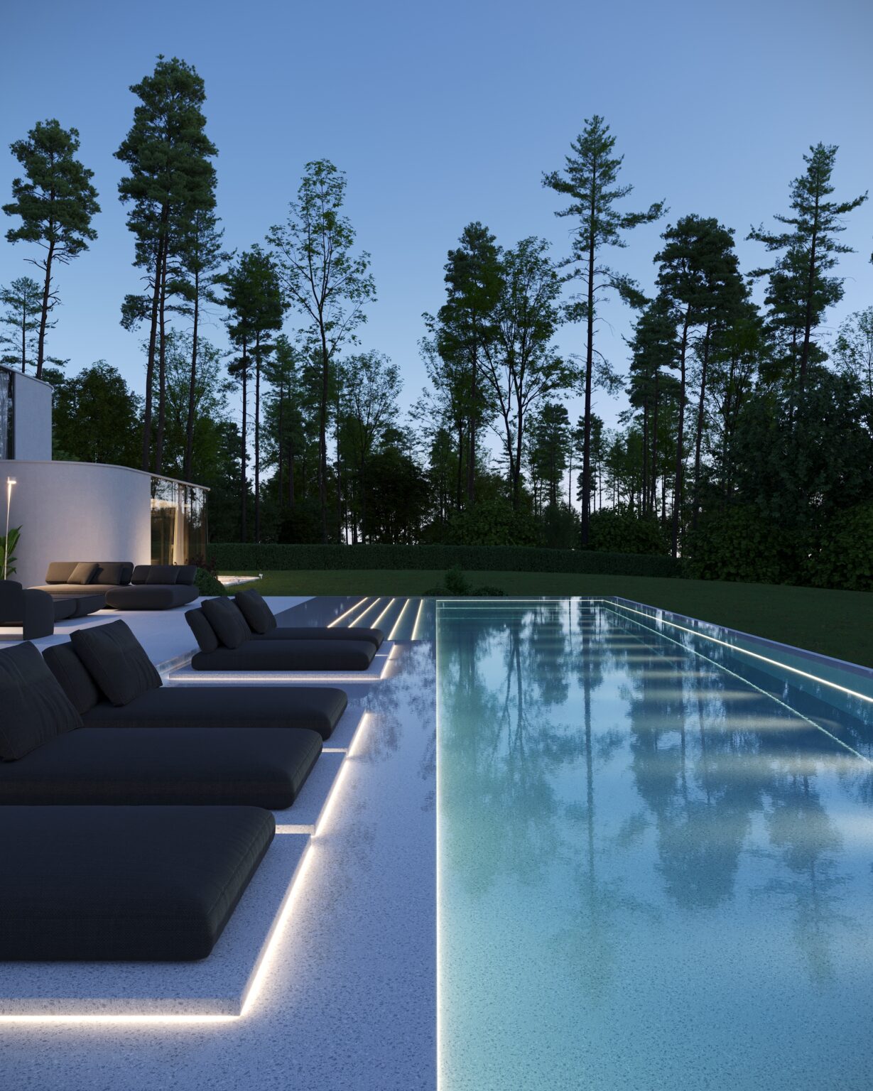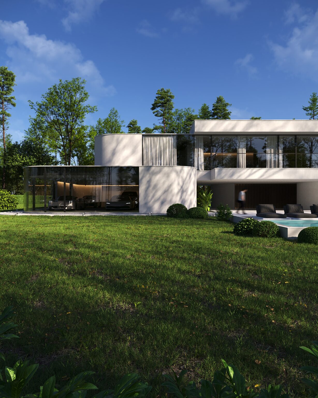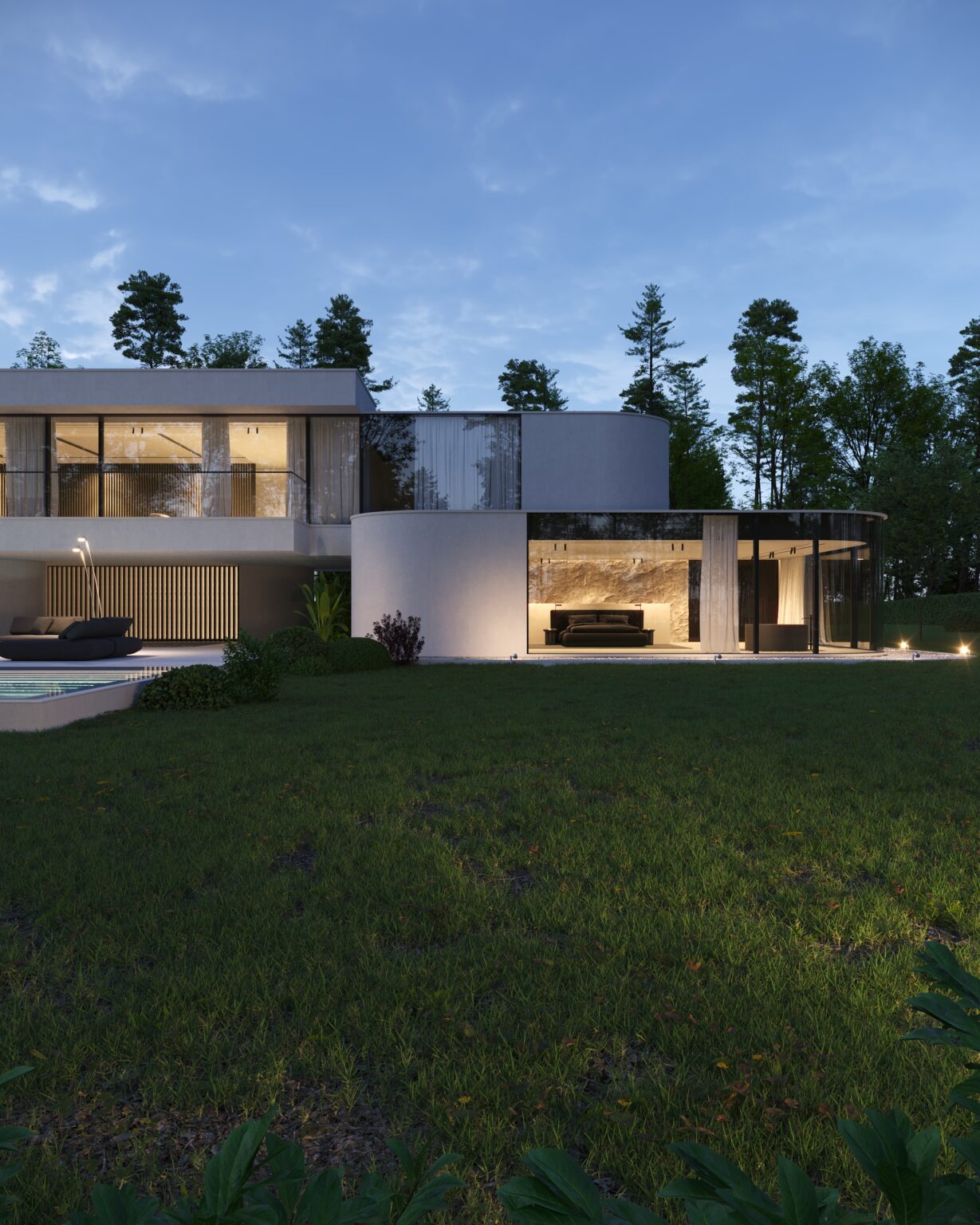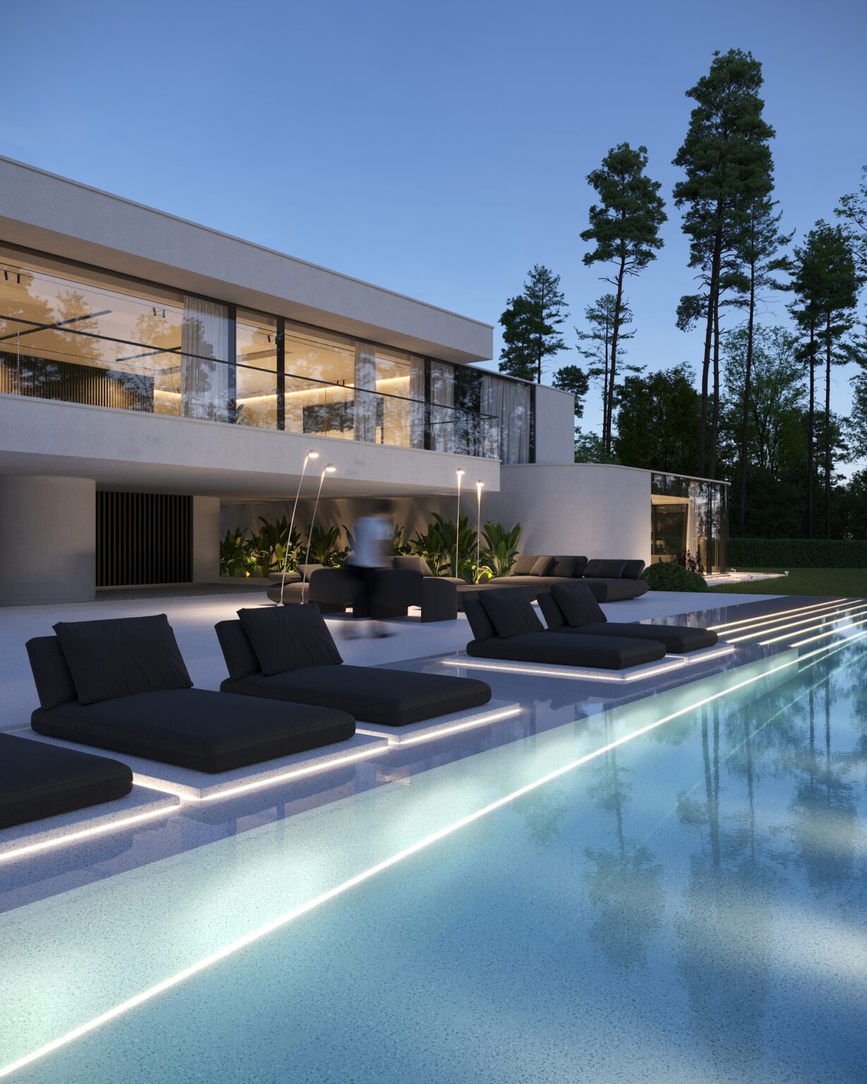 Na parterze znajduje się duży taras z płynnie przechodzącymi przestrzeniami dookoła, zapewniając idealne warunki do wypoczynku na świeżym powietrzu. Przestronny taras z minimalistycznymi leżakami i wbudowanym oświetleniem wokół uzupełnia elegancki basen, który gładko przechodzi w rozległy zielony trawnik. Elementy oświetleniowe dodają miękkiego, przytulnego światła w godzinach wieczornych, czyniąc dom idealnym miejscem do prywatności lub spotkań z przyjaciółmi.