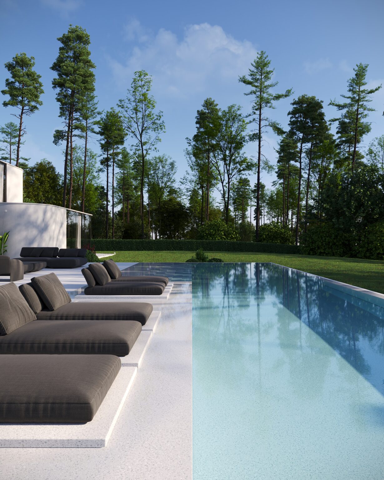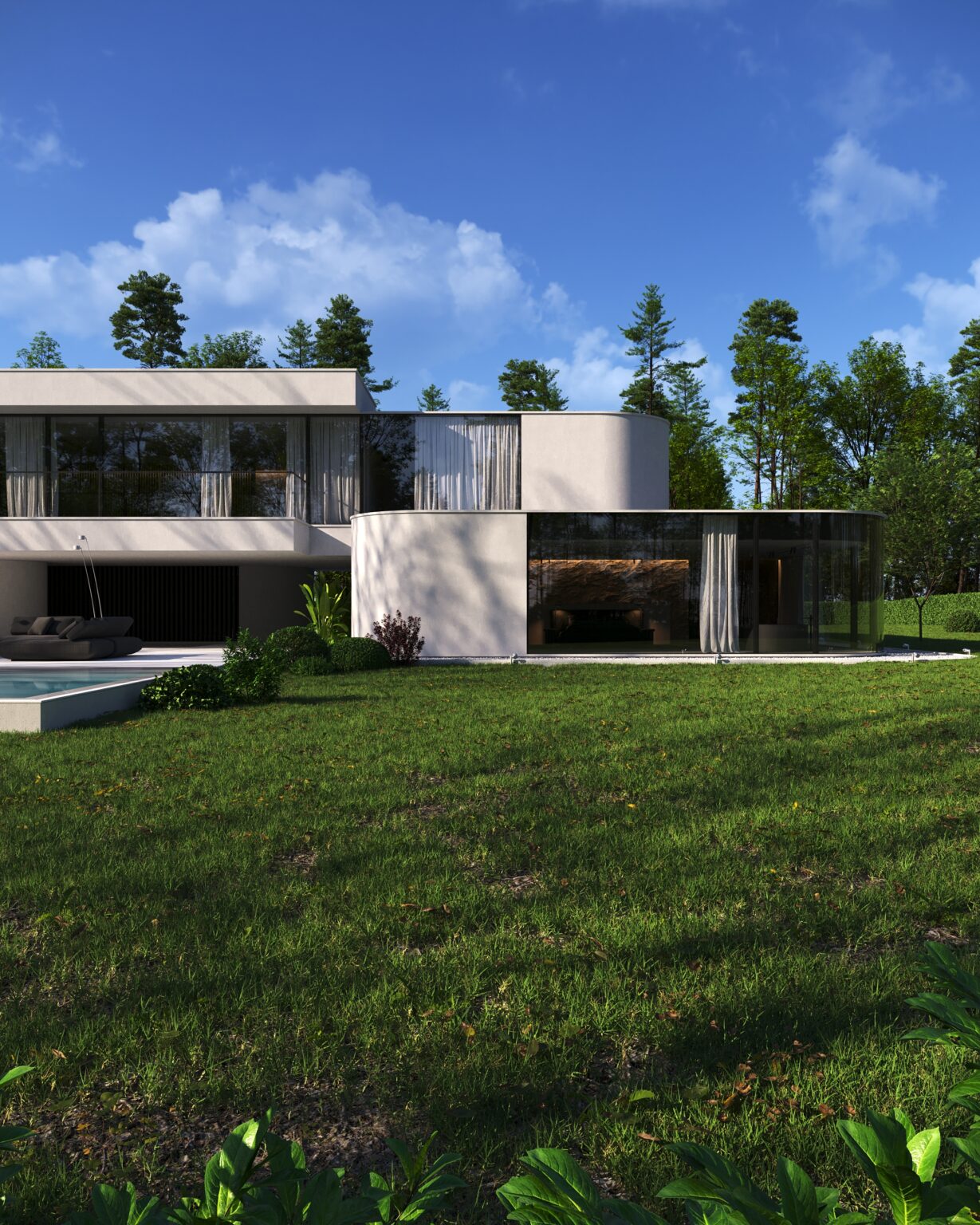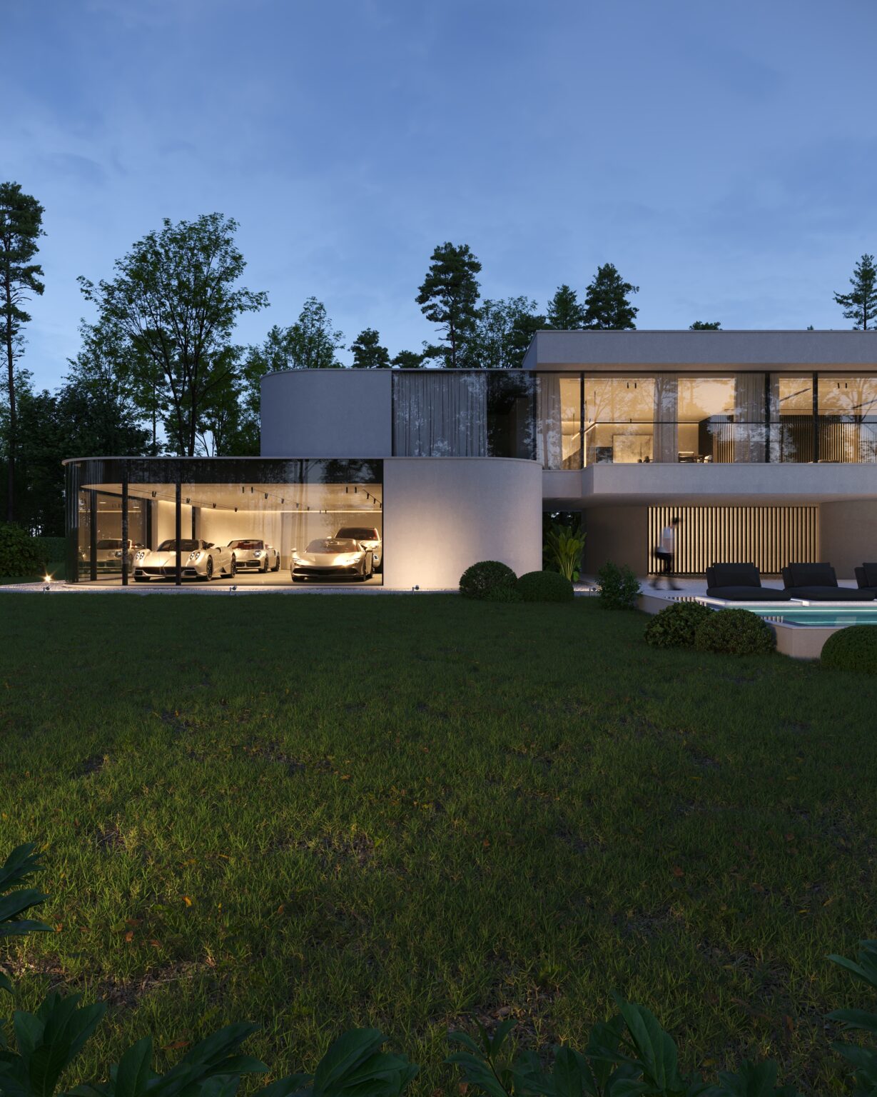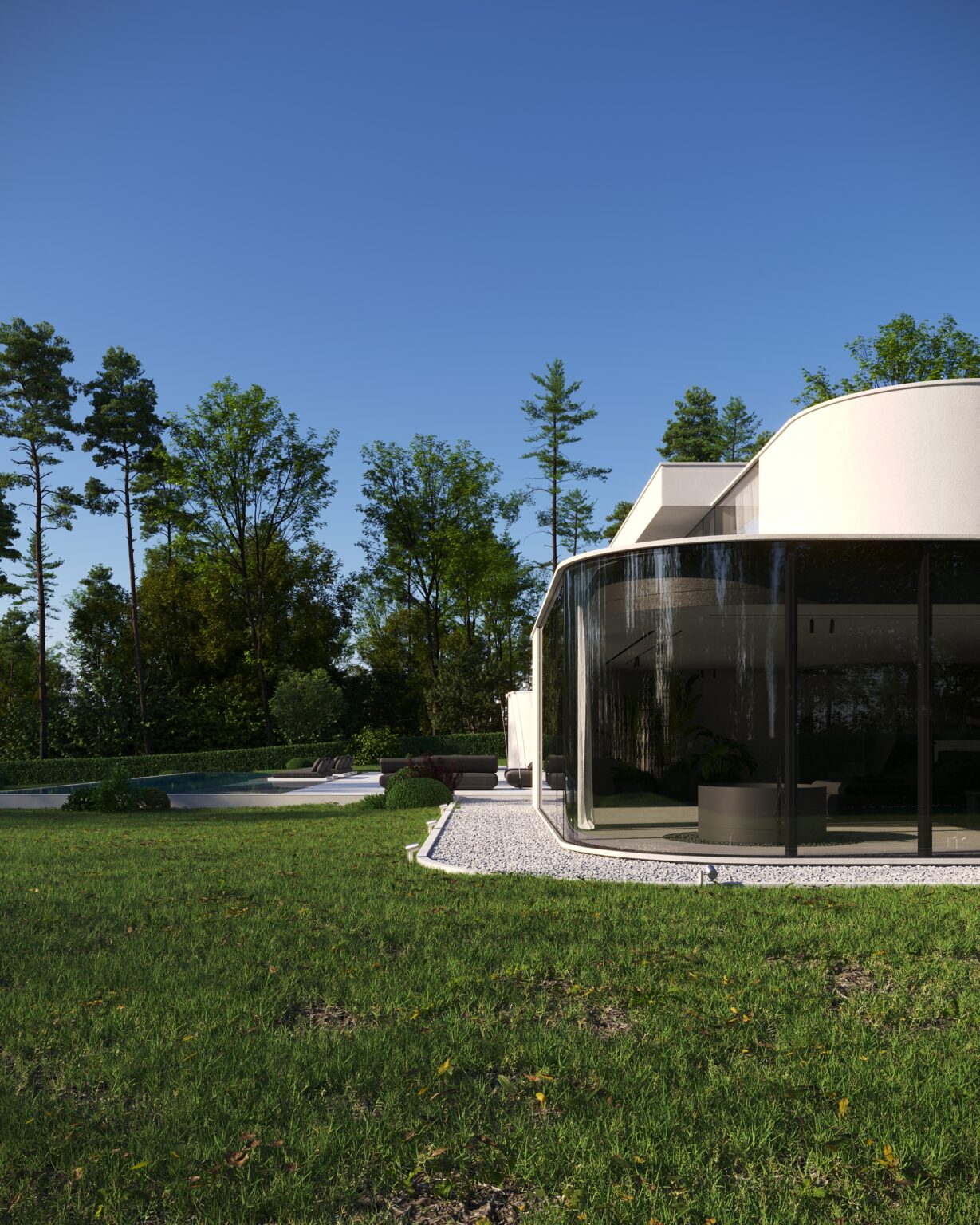 Na parterze znajduje się duży taras z płynnie przechodzącymi przestrzeniami dookoła, zapewniając idealne warunki do wypoczynku na świeżym powietrzu. Przestronny taras z minimalistycznymi leżakami i wbudowanym oświetleniem wokół uzupełnia elegancki basen, który gładko przechodzi w rozległy zielony trawnik. Elementy oświetleniowe dodają miękkiego, przytulnego światła w godzinach wieczornych, czyniąc dom idealnym miejscem do prywatności lub spotkań z przyjaciółmi.