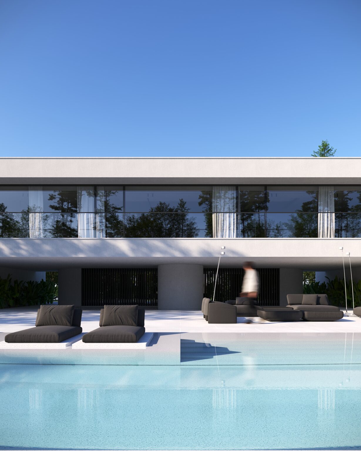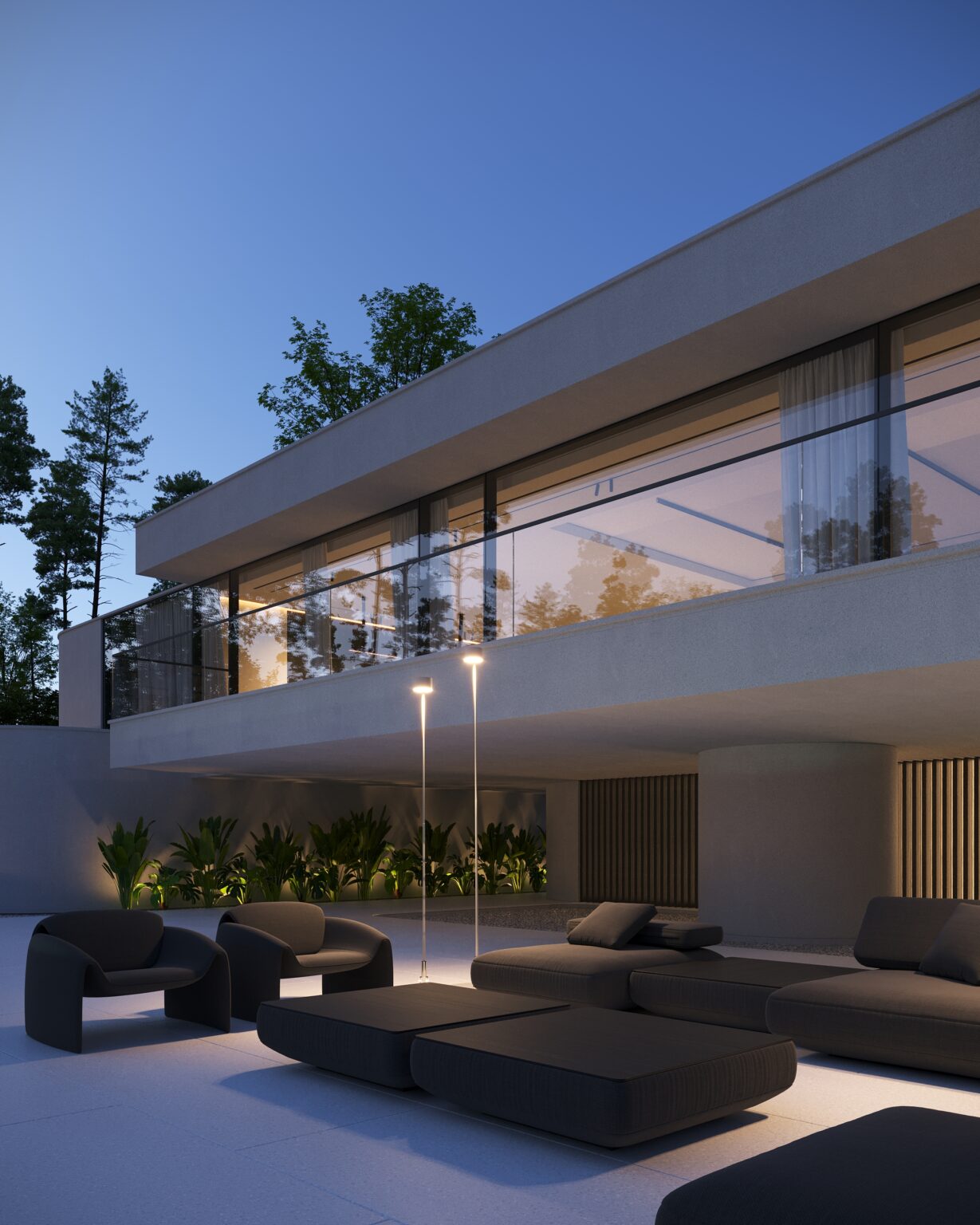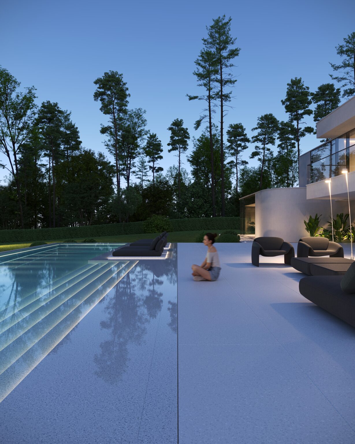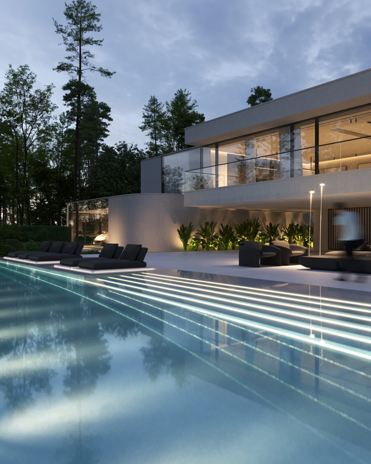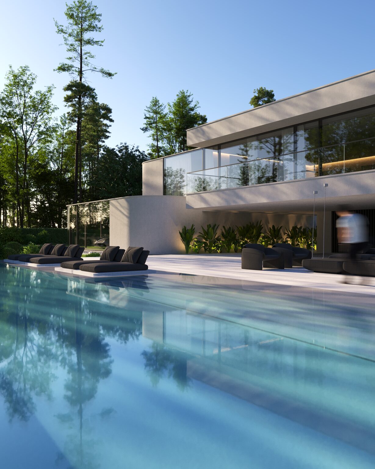 Na parterze znajduje się duży taras z płynnie przechodzącymi przestrzeniami dookoła, zapewniając idealne warunki do wypoczynku na świeżym powietrzu. Przestronny taras z minimalistycznymi leżakami i wbudowanym oświetleniem wokół uzupełnia elegancki basen, który gładko przechodzi w rozległy zielony trawnik. Elementy oświetleniowe dodają miękkiego, przytulnego światła w godzinach wieczornych, czyniąc dom idealnym miejscem do prywatności lub spotkań z przyjaciółmi.
