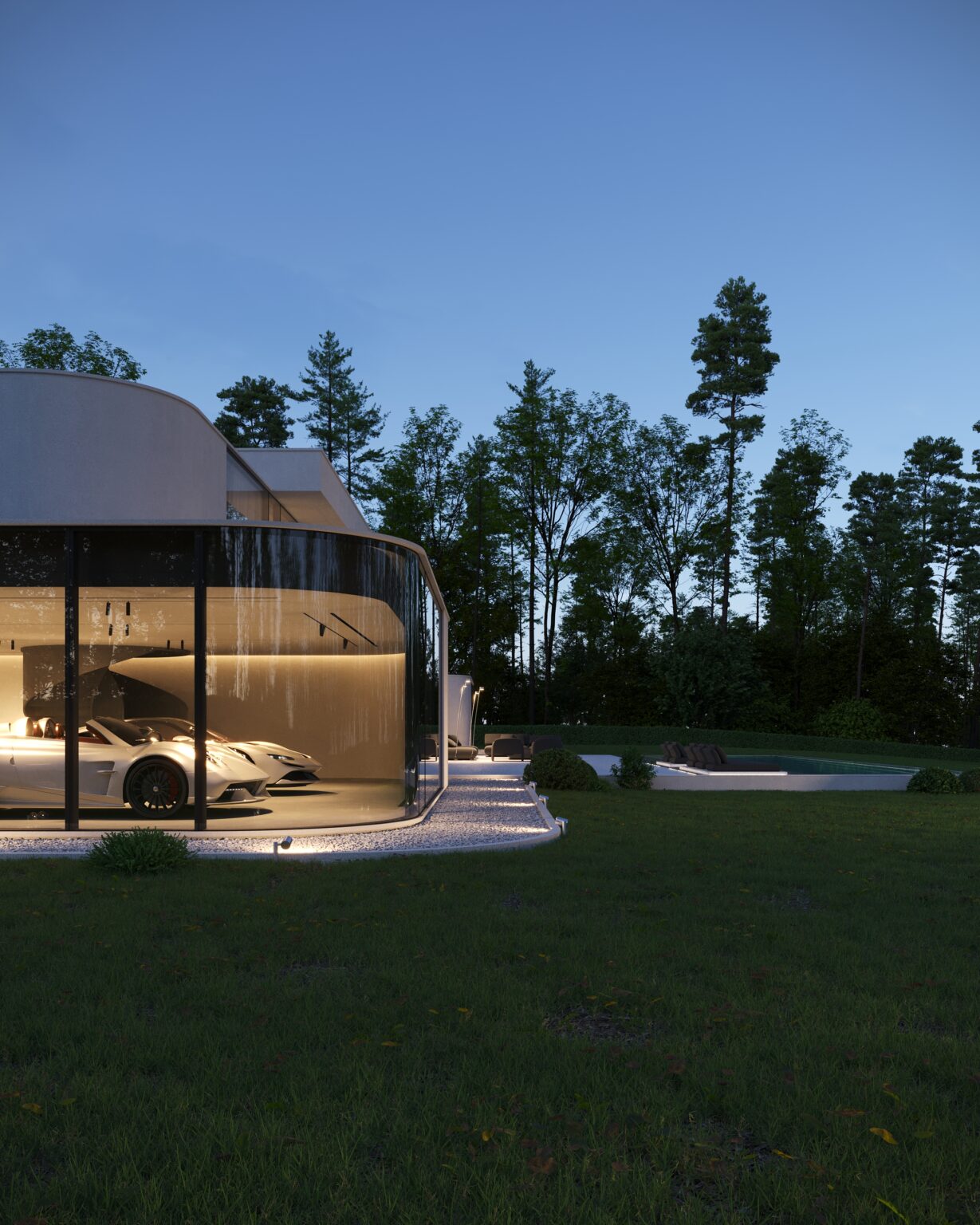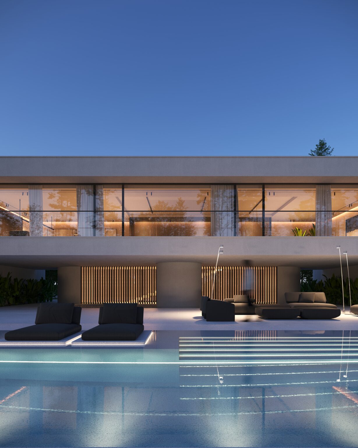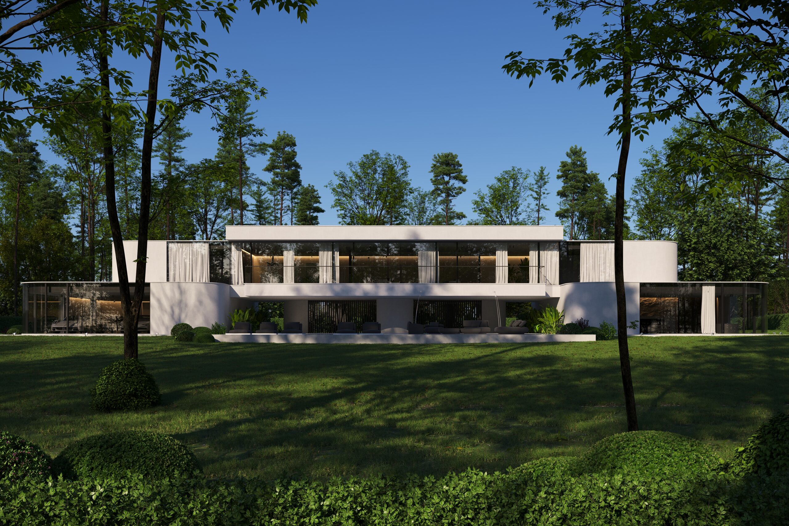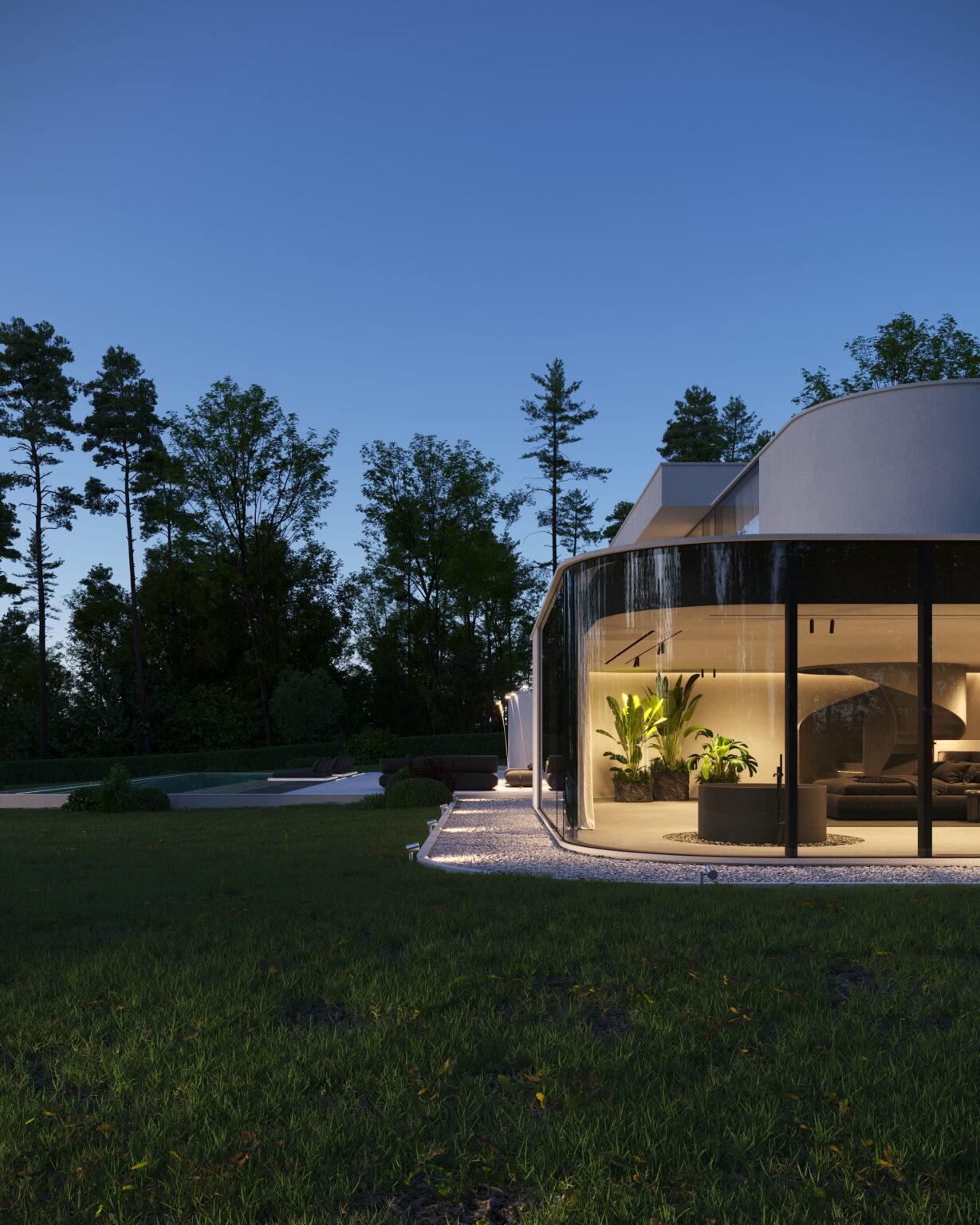 Na parterze znajduje się duży taras z płynnie przechodzącymi przestrzeniami dookoła, zapewniając idealne warunki do wypoczynku na świeżym powietrzu. Przestronny taras z minimalistycznymi leżakami i wbudowanym oświetleniem wokół uzupełnia elegancki basen, który gładko przechodzi w rozległy zielony trawnik. Elementy oświetleniowe dodają miękkiego, przytulnego światła w godzinach wieczornych, czyniąc dom idealnym miejscem do prywatności lub spotkań z przyjaciółmi.