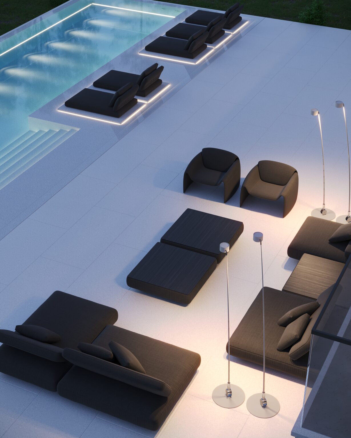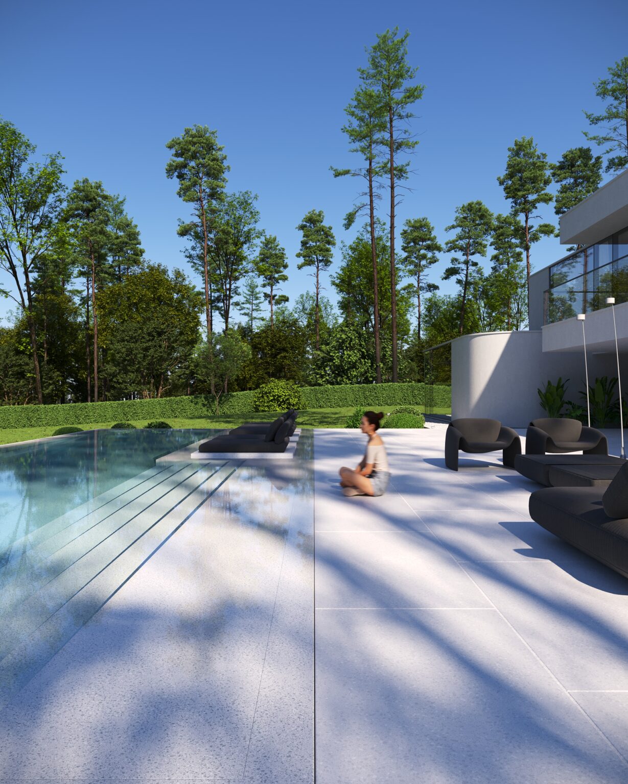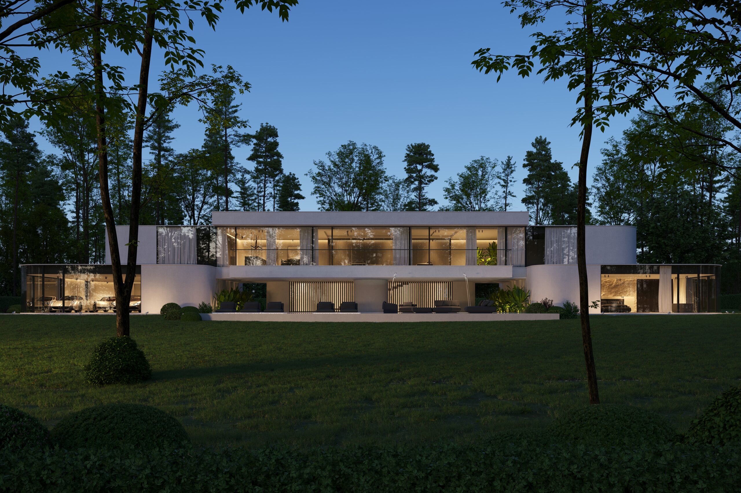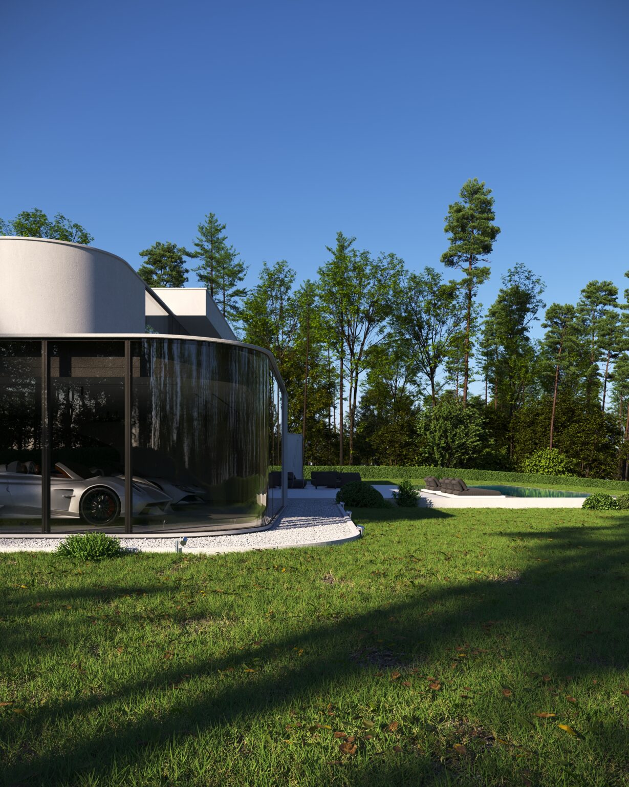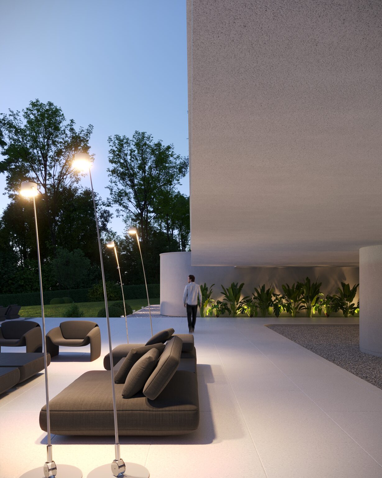 Na parterze znajduje się duży taras z płynnie przechodzącymi przestrzeniami dookoła, zapewniając idealne warunki do wypoczynku na świeżym powietrzu. Przestronny taras z minimalistycznymi leżakami i wbudowanym oświetleniem wokół uzupełnia elegancki basen, który gładko przechodzi w rozległy zielony trawnik. Elementy oświetleniowe dodają miękkiego, przytulnego światła w godzinach wieczornych, czyniąc dom idealnym miejscem do prywatności lub spotkań z przyjaciółmi.