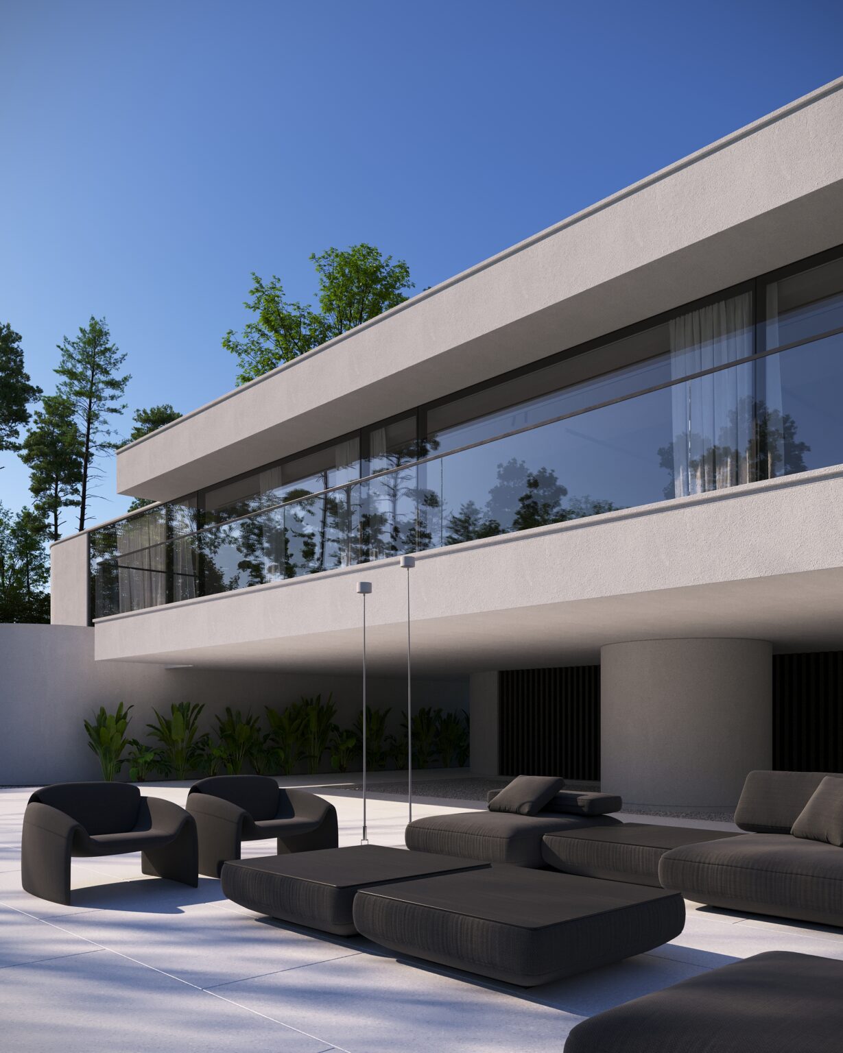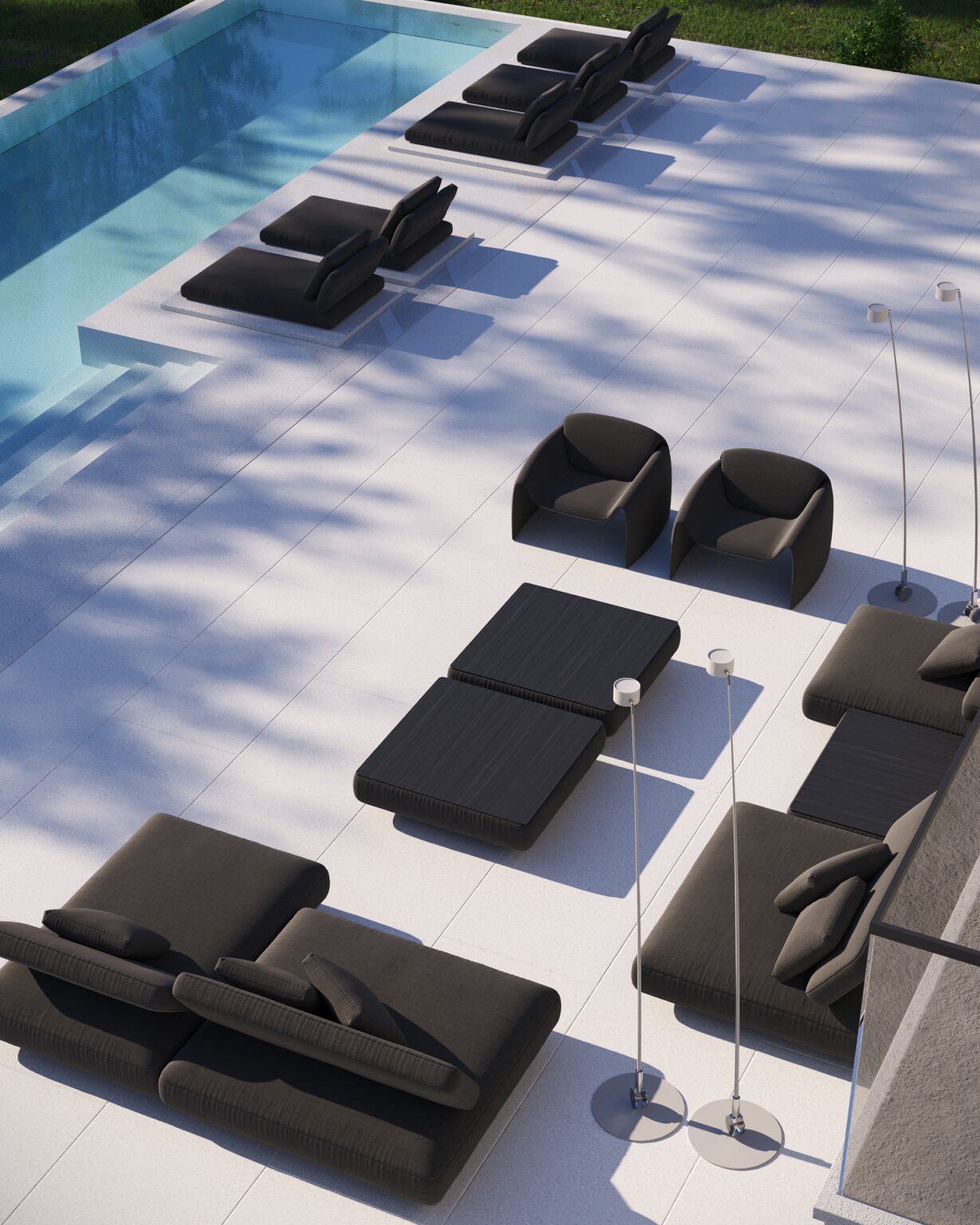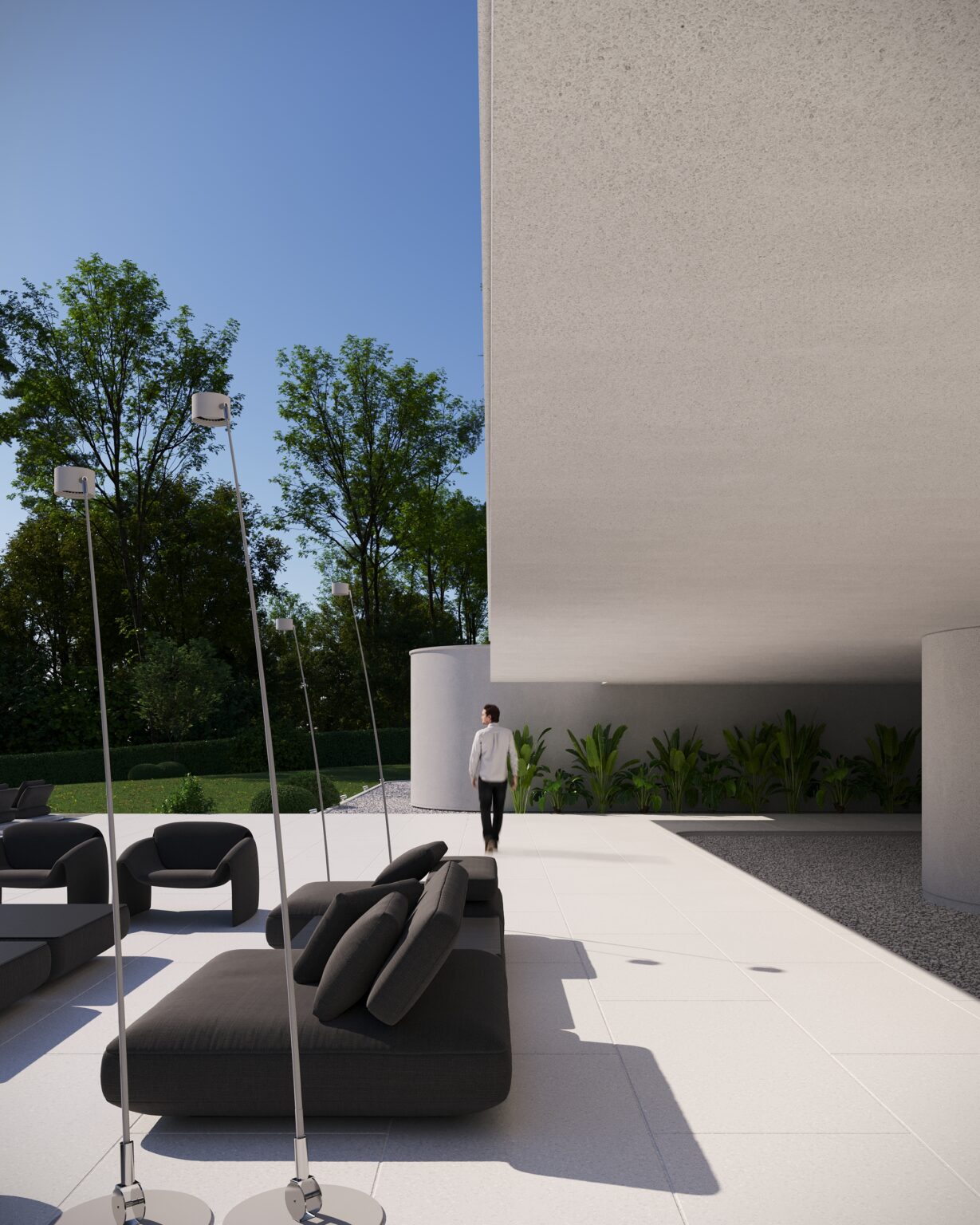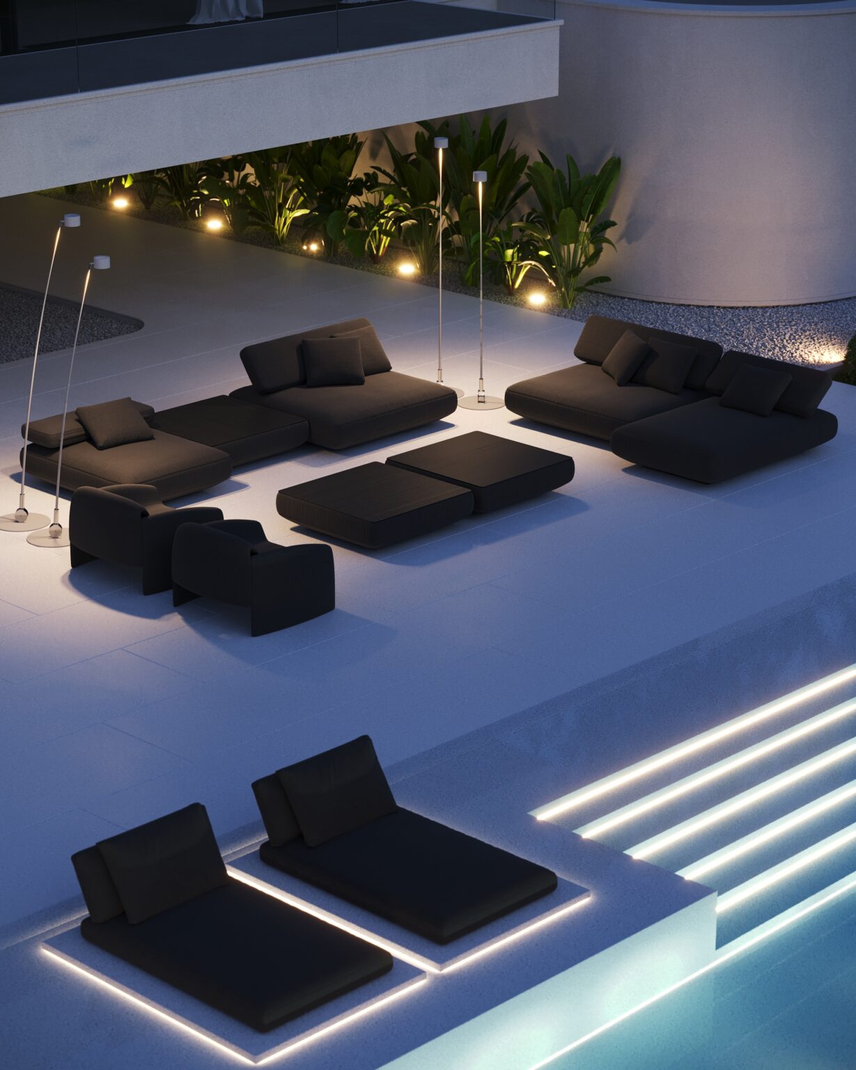 Na parterze znajduje się duży taras z płynnie przechodzącymi przestrzeniami dookoła, zapewniając idealne warunki do wypoczynku na świeżym powietrzu. Przestronny taras z minimalistycznymi leżakami i wbudowanym oświetleniem wokół uzupełnia elegancki basen, który gładko przechodzi w rozległy zielony trawnik. Elementy oświetleniowe dodają miękkiego, przytulnego światła w godzinach wieczornych, czyniąc dom idealnym miejscem do prywatności lub spotkań z przyjaciółmi.