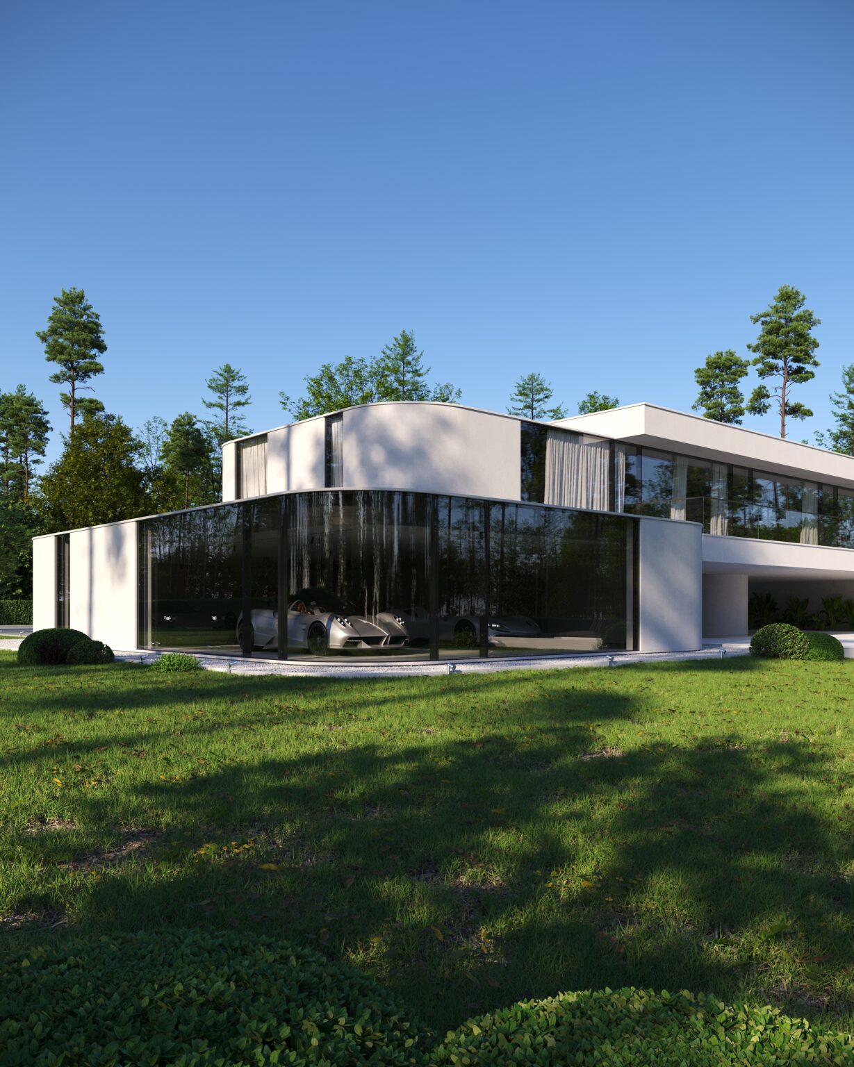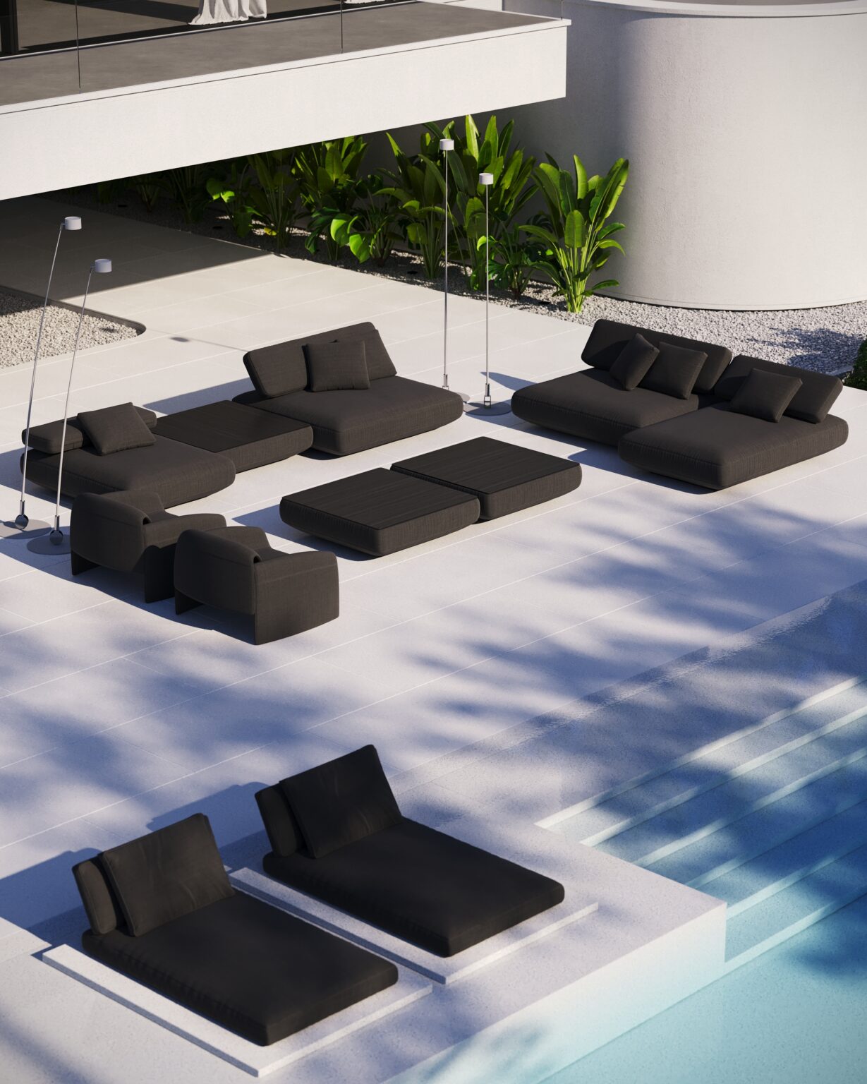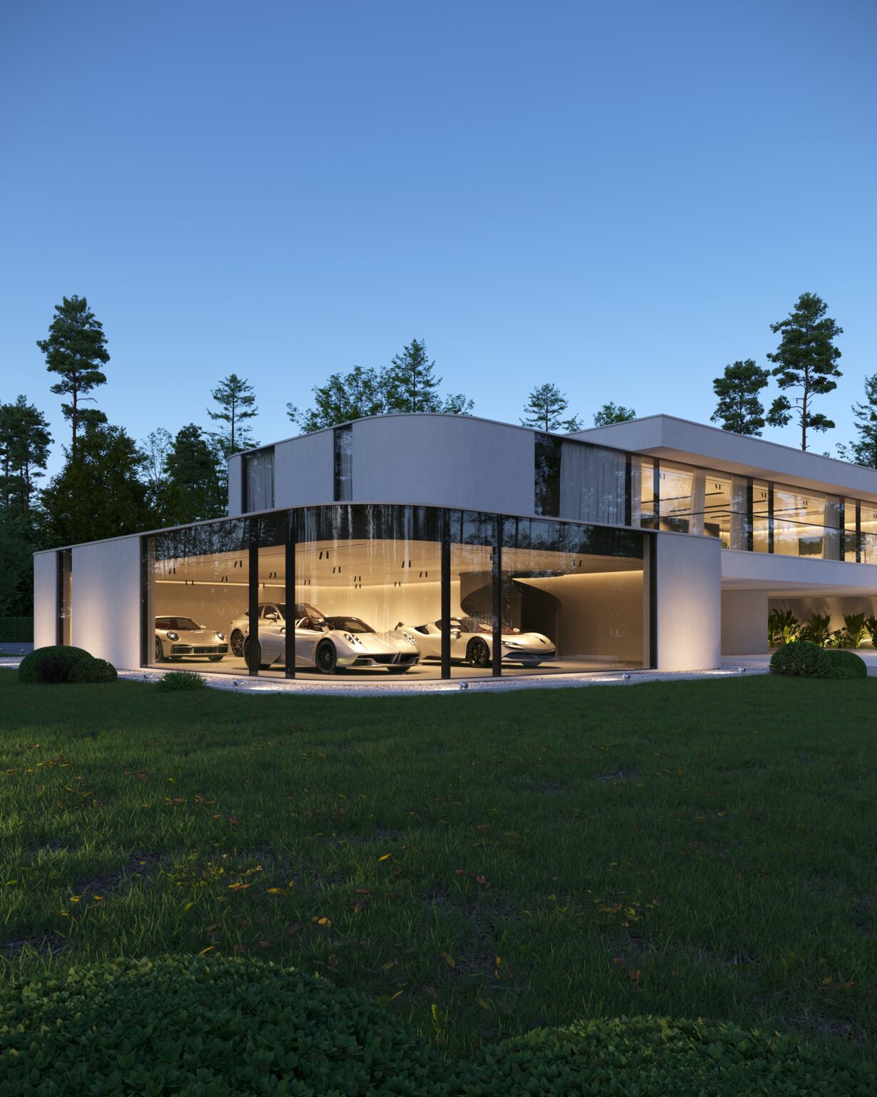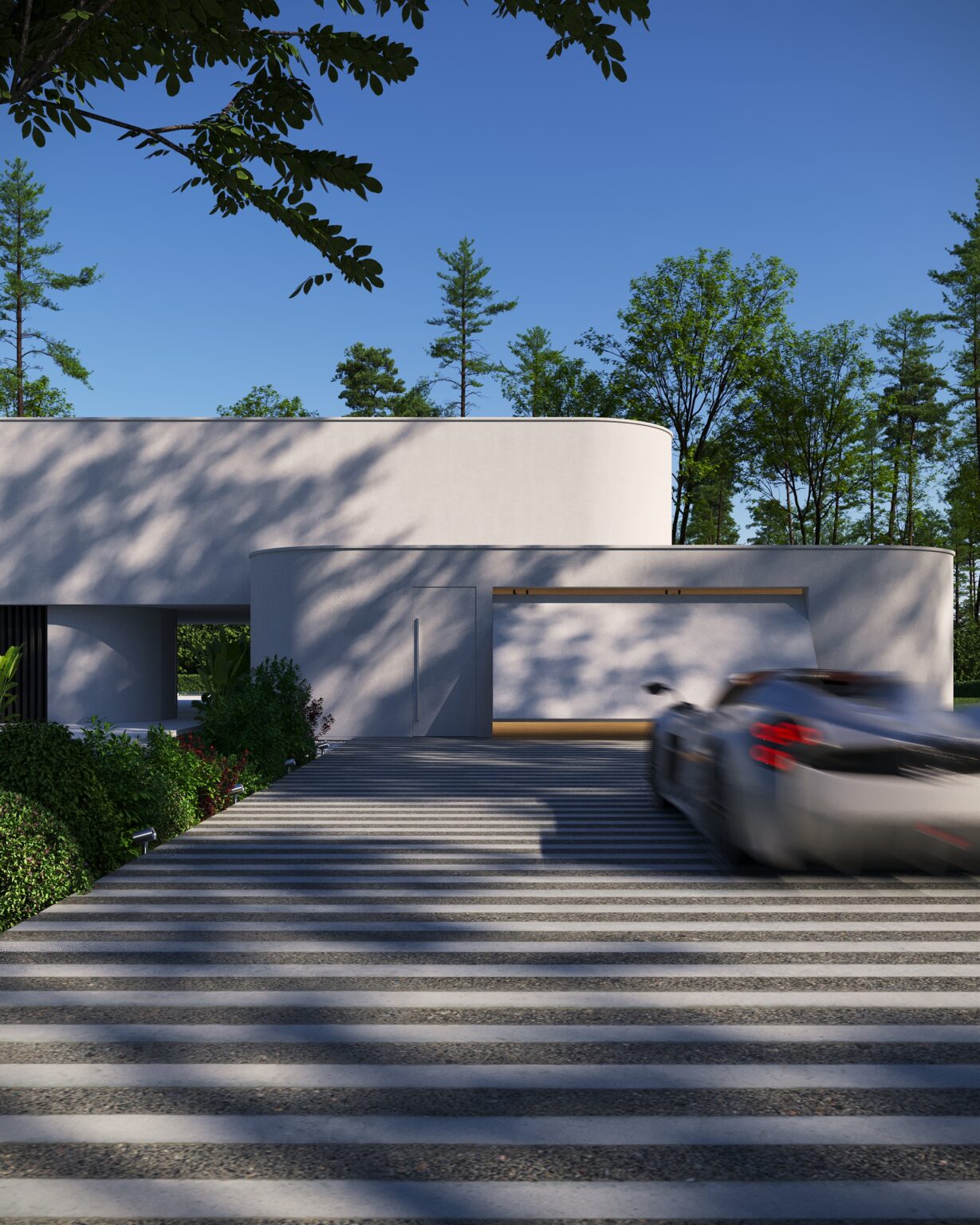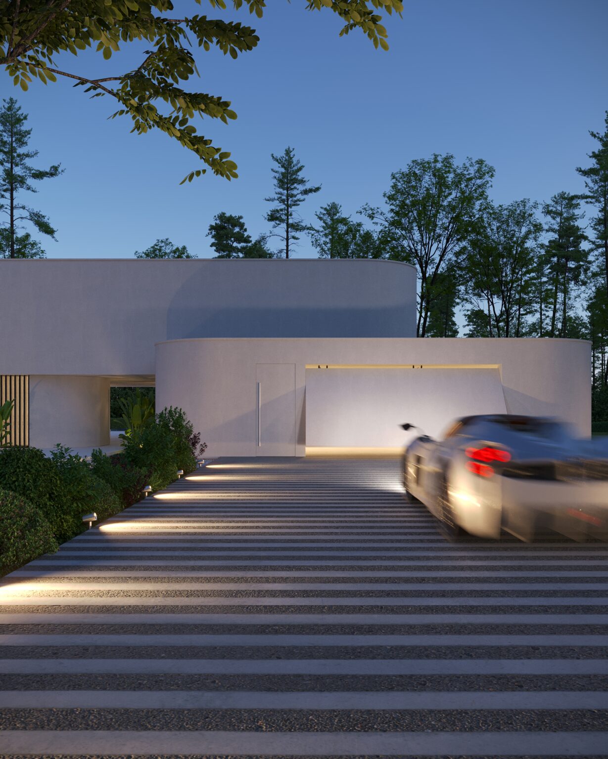 Na parterze znajduje się duży taras z płynnie przechodzącymi przestrzeniami dookoła, zapewniając idealne warunki do wypoczynku na świeżym powietrzu. Przestronny taras z minimalistycznymi leżakami i wbudowanym oświetleniem wokół uzupełnia elegancki basen, który gładko przechodzi w rozległy zielony trawnik. Elementy oświetleniowe dodają miękkiego, przytulnego światła w godzinach wieczornych, czyniąc dom idealnym miejscem do prywatności lub spotkań z przyjaciółmi.