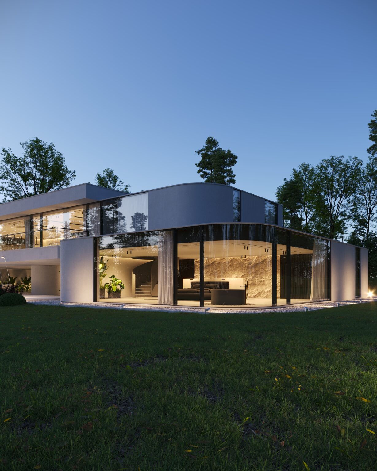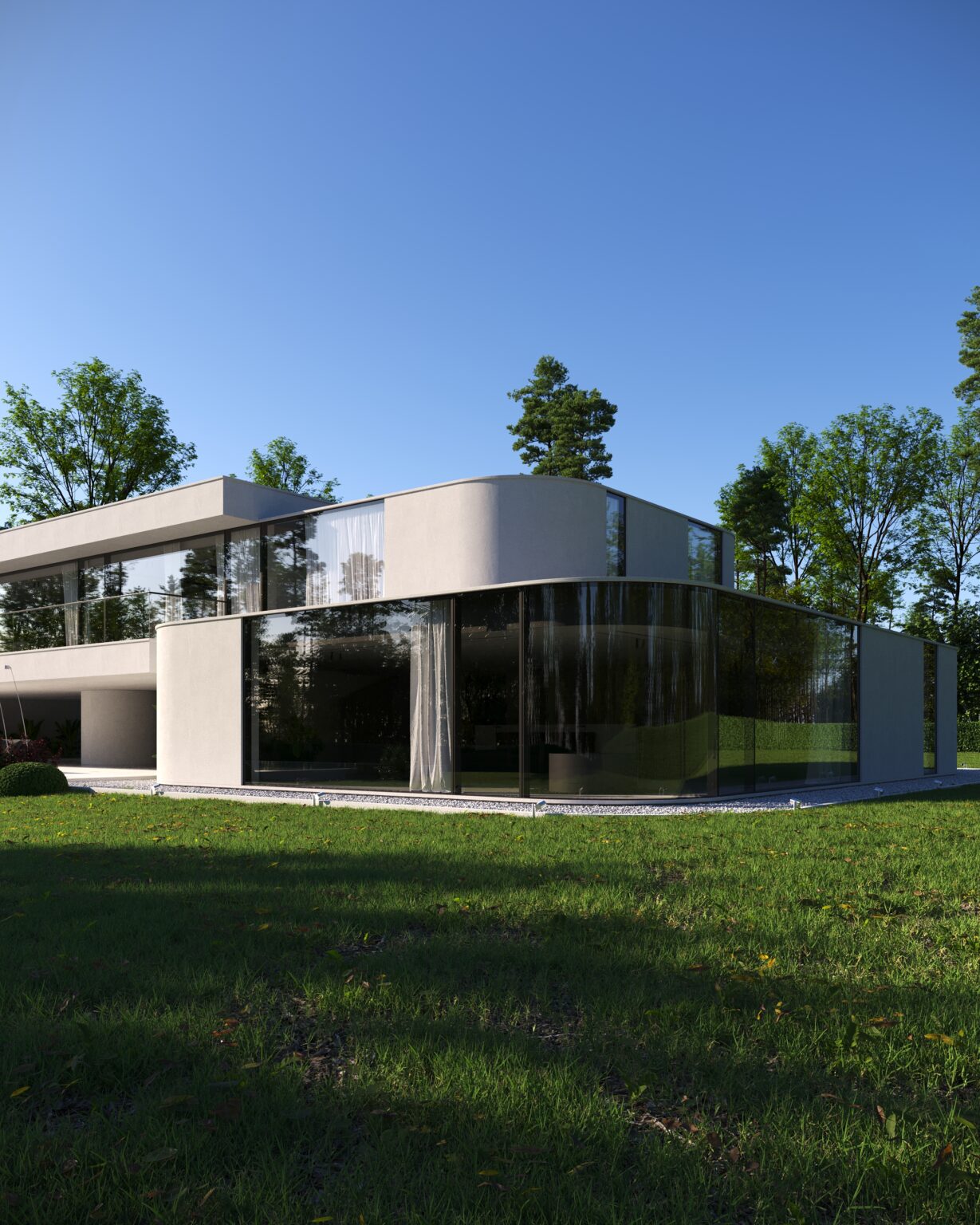Ten projekt domu na wsi został zrealizowany w stylu nowoczesnego minimalizmu i harmonijnie wpisuje się w naturalny krajobraz. Dom łączy w sobie czyste linie, duże przeszklone powierzchnie i neutralne odcienie, co podkreśla jego związek z otoczeniem. Fasada jest wykończona za pomocą szkła i białego betonu, co dodaje uczucia lekkości i otwartości.